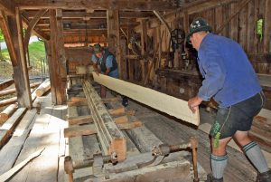: Neben Angeboten für Familien gibt es zum Tag der Freunde auch viele Handwerksvorführungen, zum Beispiel auch in der Sägemühle aus Potzmühle. Bildquelle: Bezirk Oberbayern, Archiv FLM Glentleiten.
