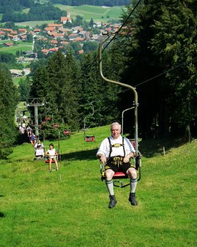 Fotos: Hötzelsperger Der Sessellift der Hochriesbahn führt bequem zur Mittelstation. Unsere Aufnahme zeigt den Ehrenvorstand des Samerberger Tourismusvereins Hans Auer bzw. MdL a.D. Adolf Dinglreiter