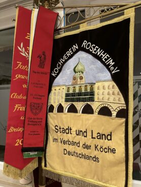 Zu 21.12.58: – Frisch herausgeputzt – die Vereinsstandarte mit Fahnenbändern des Vereins der Köche Rosenheim.