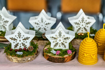 Dazu kommen die beliebten Weihnachtsguatln, also Plätzchen. Diese werden jedes Jahr von vielen fleißigen Bäckerinnen gespendet und von einem eingespielten Team appetitlich verpackt. Außerdem gibt es Kletzenbrot, Bauernbrot, Quittenbrot, manchmal auch Apfelbrot und Liköre, usw., kurz alles, was Küche und Keller hergeben. Auch die Strickerinnen sind nicht faul: Socken in jeder Größe, Loiferl und Wadlstrümpf`– je nachdem, ob östlicher oder westlicher Samerberg-, Schals, Handschuhe und Taschen werden produziert. Und wer sonst noch was braucht, hier findet er alles was das Herz begehrt: Papier, Holz, Gips und Bienenwachs werden zu den schönsten Dekorationen verarbeitet.