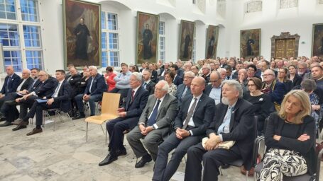 204032: Im Fürstensaal v.r.n.l.: Mechthilde Wittmann MdB, Milan Horáček, OB Thomas Kiechle, Präsident Alain Terrenoire, Bundespräsident a.D. Joachim Gauck, Europaminister Eric Beißwenger, Dirk Voß, Generalsekretär Prof. Pavo Barišić, Bischof Franjo Komarica, Prof. Ihor Zhaloba; dahinter v.r. Stephanie Waldburg, Dekanin Dorothee Löser, Vizeminister a.D. Jan Sechter, Staatsminister a.D. Josef Miller, Britta Geithe, Sicherheit Gauck, Staatsminister a.D. Dr. Ludwig und Miriam Spaenle, Andreas Raab. (Foto J. Kijas)