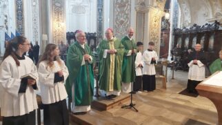 100700: Festgottesdienst in der Basilika St. Lorenz: v.l.n.r. Bischof Franjo Komarica, Bischof Bertram Meier und Domkapitular Thomas Rauch. (Foto Johannes Kijas)