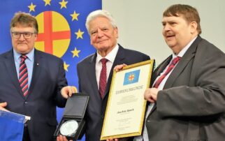 Ehrung Gauck (Foto Vanja Gavran) und IMG_7837 (Foto Dagmar Jessat): Verleihung der Sonderstufe der Paneuropa-Verdienstmedaille an Bundespräsident a.D. Joachim Gauck (Mitte) durch Johannes Kijas (links) und Bernd Posselt