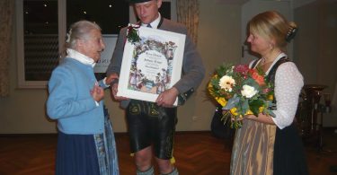 Dabei sorgten die Musikanten der Kapelle „Gießenbachklang“ für die musikalische Gestaltung und Pater Matthias vom nahen Kloster Reisach würdigte die Hochzeitslader in seiner Predigt als echte Wahrer christlichen Brauchtums. „Ihr habt Johannes den Täufer als Euren Patron auserwählt, auch dieser hat zu seiner Zeit gezeigt, wo es lang geht, damit habt Ihr eine starke Verbundenheit mit dem Heiligen“, so der Karmeliten-Pater, der noch weitere Gemeinsamkeiten aus der Bibel, unter anderem mit der Geschichte von der Hochzeit in Kanaa erläuterte. Das traditionelle Gruppenbild nach dem Gottesdienst ging aufgrund der Hochzeitslader-Routine und wegen eines eiskalten Inntal-Windes rasch über die Bühne, alsdann zog die illustre Festgemeinde geschlossen und mit Musik zurück zum Gruberhofstadl. Dort dankte Bürgermeister Hajo Gruber für die Veranstaltungsvergabe in die geschichtsreiche Gemeinde Kiefersfelden und er stellte das Jubiläumsjahr 2018 mit „400 Jahre Volkstheater, dem ältesten in Deutschland“ vor. Chronist Christian Glas von der Gemeinschaft der Hochzeitslader dankte zuerst den örtlichen Hochzeitsladern Hans Hollerieth und Sepp Goldmann für die Organisation der Zusammenkunft und er begrüßte unter den Ehrengästen unter anderem die beiden CSU-Landtagsabgeordneten Otto Lederer und Klaus Stöttner, die ihrerseits eine Einladung der Hochzeitslader in den Bayerischen Landtag aussprachen. Seit 1960 gibt es das Hochzeitsladertreffen, damals und auch in Kiefersfelden immer noch dabei waren die hochbetagten Hochzeitslader Bertl Heigl aus Heufeld und Ernst Rupp aus Prien – ihnen galt ein ganz besonders herzlicher Willkommensgruß. Unter den aktiven Hochzeitsladern befanden sich Landrat Toni Speer aus Garmisch-Partenkirchen, Bezirksrat und Bayernbund-Landesvorsitzender Sebastian Friesinger, Bürgermeister Hans Schönauer vom Irschenberg sowie Bayernbund-Kreisvorsitzender Christian Glas. Ernst und heiter – so könnte die ganztägige Zusammenkunft der Zunft der Hochzeitslader bezeichnet werden. Ernst deswegen, weil die Aufgabe, den frisch vermählten Eheleuten einen unvergeßlichen Tag zu machen, gar nicht so einfach ist. „Hochzeit ist nicht nur Essen, Trinken und Feiern, sondern eine Liturgie, der Beginn eines neuen Lebensweges“, so die gastgebenden Hochzeitslader Hans Hollerieth und Sepp Goldmann. Und heiter allein schon deswegen, weil die Hochzeitslader von Haus aus eine fröhliche Gemeinschaft sind, was sich ganz besonders beim Aus- und Gstanzlsingen am nachmittag bemerkbar machte.
