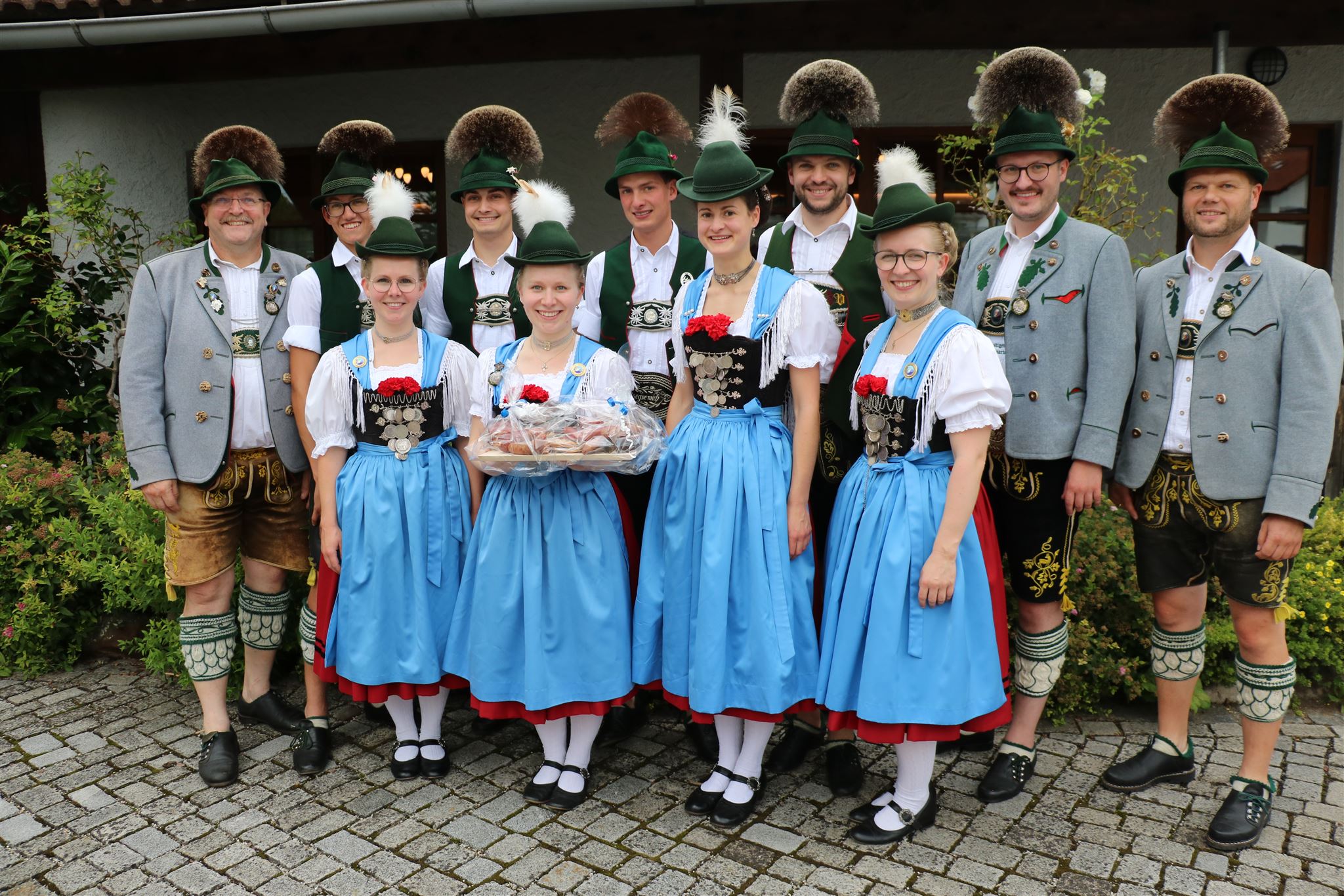 Zum 21. Mal in Folge gewannen die Aktiven des Trachtenvereins „Die lustigen Wildenwarter“ das Gruppenplattln der Aktiven. Der Vorsitzende Peter Voggenauer (links) und seinen beiden Stellvertreter Florian Stoib (rechts) und Helmut Freund (zweiter von rechts) freuen sich mit ihrer siegreichen Gruppe