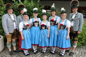 Die erfolgreichen Wildenwarter Dirndl (von links) Martina Huber, Michaela Rosenwink, Irmengard Huber, Johanna Rosenwink, Marlies Huber mit dem Vorsitzenden Peter Voggenauer (links) und seinen beiden Stellvertreter Florian Stoib (rechts daneben) und Helmut Freund (rechts)