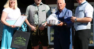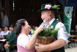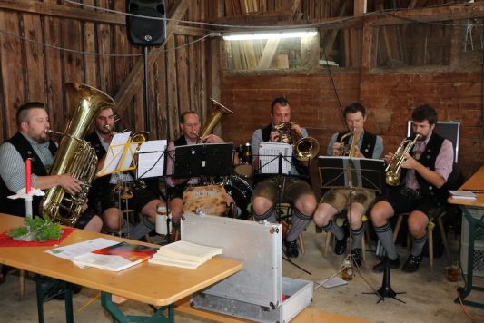 Der Jubilar und seine Gäste genoßen die Festatmosphäre sehr, die auch kulinarisch durch ein Weißwurstfrühstück vor der Andacht, Hendl und Rindsbraten zum Mittagessen, einer Kaffee- und Kuchenbar, Grillsemmeln und Steckerlfisch am Abend und einem Weißbierkarusell an ein Gaufest erinnerte. Auch musikalisch wurde die Feierlichkeit passend von der Blangä Musi untermalt. „Schee, dass mer wieder mal zsam kemma san, da merkt ma erst so richtig, was ois fehlt“ war die einhellige Meinung unter den Gästen, die bis in die späten Abendstunden hinein beinander saßen.
