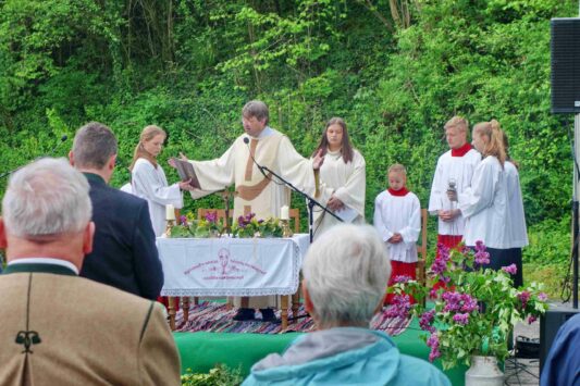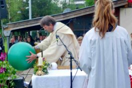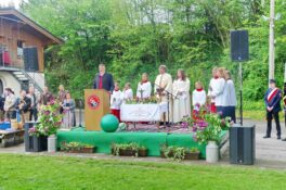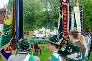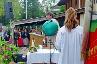 „Wie bringen wir Sport und Gott unter einen Hut? Ganz einfach: Gott ist immer in unserer Mitte“ – nach diesem Predigteinstieg begann Gaiser seine weiteren Ausführungen. Als Vater eines begeisterten Handballspielers warb er dafür, dass der Sport mit seinen Vorbildern, Leistungen und Freuden stets von Gerechtigkeit und Fairness geprägt sein möge. Dass dies nicht so ganz einfach ist, zeigte er beim Vergleich der unterschiedlich großen Bälle der vier Abteilungen des SV Riedering. „Die Bälle vom Tischtennis, die Schneebälle der Skifahrer, der Ball der Fußballer oder gar der Gymnastikball der Gesundheitsabteilung – sie sind kleiner oder größer. Aber im Sport, im Leben und im Glauben zählt nicht, welche Ballgröße man spielt, wer mehr Tore schießt oder wer schneller ist. Vielmehr ist es wichtig, ohne Neid ein lohnenswertes Ziel zu erreichen. In diesem Sinne gratuliere ich dem SV Riedering, dass ihm dieses Ziel in all den Zeiten mit Höhen und Tiefen immer wieder gelungen ist“. Zum Abschluss des festlichen Glaubensbekenntnisses auf dem Sportplatz bedankte sich Tobias Gaiser bei den ehemaligen Oberministeranten Lisa Beier und Elias Kahler für die organisatorische und inhaltliche Vorbereitung der Wortgottesfeier.