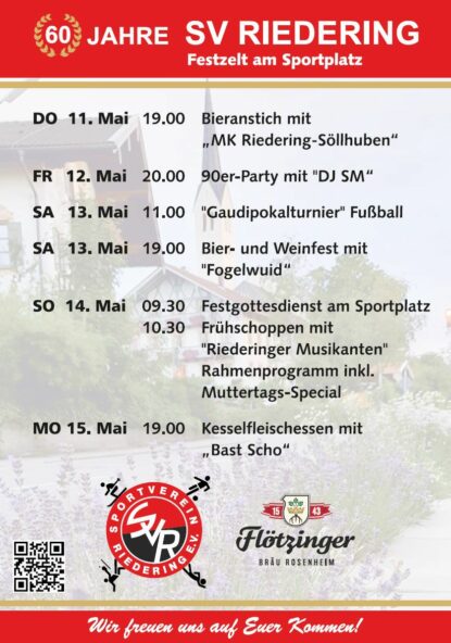 Das 60jährige Bestehen des SV Riedering wird mit einem Festzelt am Sportplatz gefeiert, den Auftakt bildet am Donnerstag, 11. Mai ab 19 Uhr der Bieranstich mit der Musikkapelle Riedering-Söllhuben. Am Freitag, 12. Mai ist 90er-Partyy mit DJ SM und der Samstag beginnt um 11 Uhr mit einem Fußball-Gaudi-Pokal-Turnier und er endet mit einem Bier- und Weinfest mit der Kapelle „Fogelwuid“. Absoluter Höhepunkt werden am Sonntag, 14. Mai ab 9.30 Uhr ein Festgottesdienst am Sportplatz sowie anschließend ein Frühschoppen mit den Riederinger Musikanten sein. Das Rahmenprogramm enthält auch ein Muttertags-Special. Den Abschluss finden die Festlichkeiten am Montag, 15. Mai mit einem Kesselfleischessen zu Flötzinger-Getränken und zu den Klängen der Kapelle „Bast scho“.