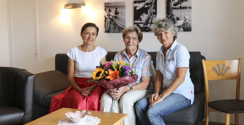 Bericht und Foto: Prien Marketing GmbH – Bildunterschrift: (v.l.n.r.) Am Mittwoch, 18. Juli 2018 bedankte sich Andrea Hübner, Geschäftsführerin der Prien Marketing GmbH zusammen mit Judith Schmidbauer, Mitarbeiterin des Tourismusbüros Prien recht herzlich bei Elfriede Müller und überreichten einen bunten Blumenstrauß.