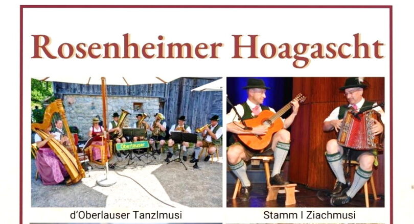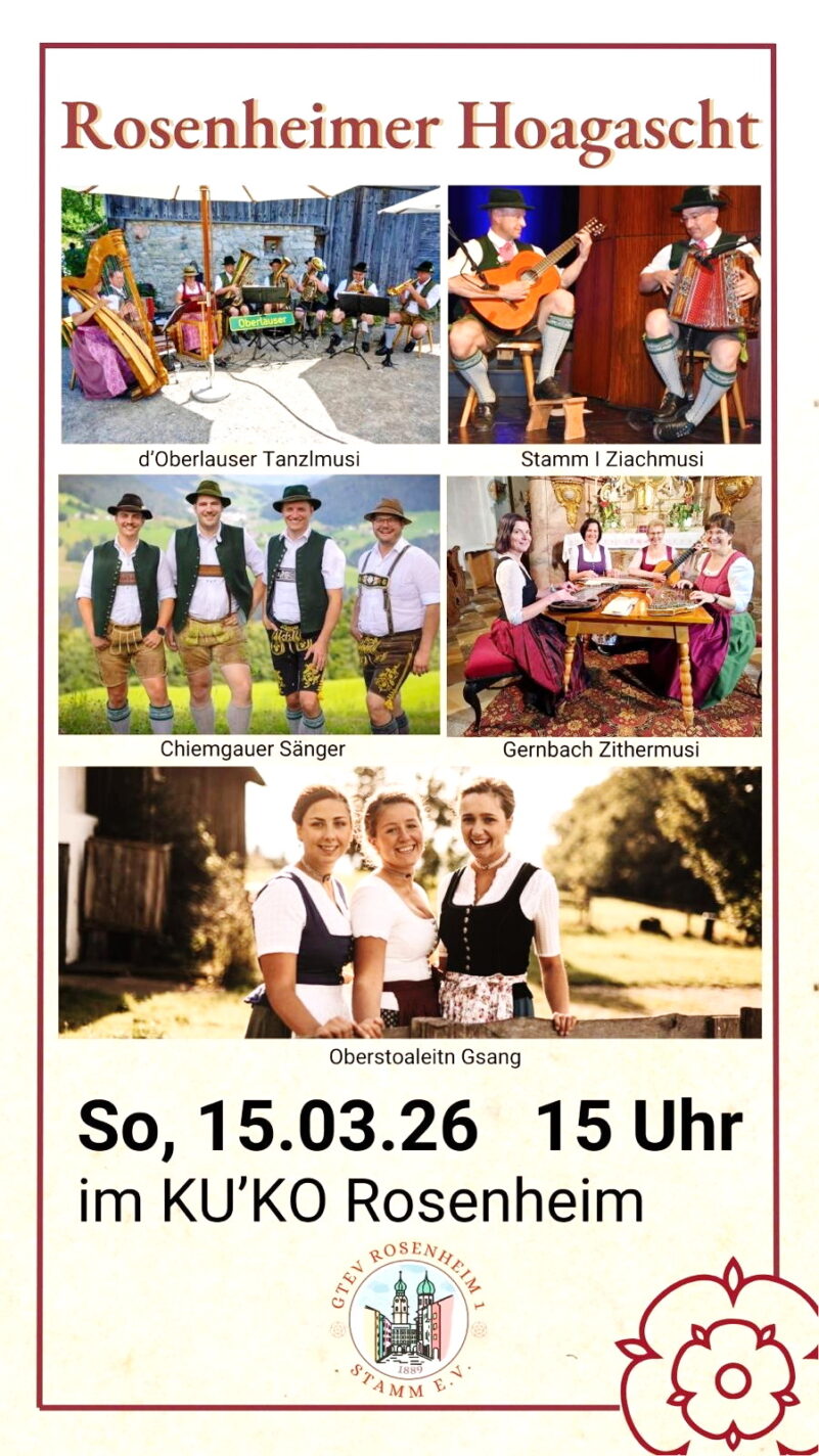 Am 15. März 2026 um 15 Uhr wird der „Rosenheimer Hoagascht 2026“ im Kultur- und Kongresszentrum stattfinden. Durch das Programm führt Siamak Golshani, ein Vollblutmusiker und von Kindheit an Mitglied des Vereins. Er hat für den Jubiläumshoagascht eine besonders stimmige Auswahl an Gesangs- und Musikgruppen zusammengestellt. Es erwarten Sie „d`Oberlauser Tanzlmusi“, die „Chiemgauer Sänger“, die „Gernbach Zithermusi“, der „Oberstoa Leitn Gesang“ sowie die vereinseigene „Stamm I Ziachmusi“. Mit dem gemischten Programm aus Gesang, Anekdoten und Musikstücken erwartet Sie ein unvergesslicher Nachmittag voller Gefühl und echter bayerischer Lebensfreude.