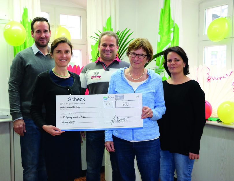 Am kommenden Samstag, den „Elften im Elften“ ab 11.11 Uhr, wird hierzulande der Beginn der neuen Faschingszeit gefeiert. Bereits seit vier Jahren veranstalten die PriMa und die benachbarte PI mit Unterstützung der ChiMa am Unsinnigen Donnerstag ein gemeinsames Fest zur närrischen Zeit. So herrschte auch am Donnerstag, 23. Februar 2017 ein reger Andrang an Zwergen, Feen und allerlei Fantasiegestalten im „Priener Märchenland“ zwischen der Polizeiinspektion und dem Haus des Gastes. Viele Mitarbeiterinnen und Mitarbeiter der drei Organisationen halfen, allesamt fleißig wie die „Goldmarie“ im Märchen, bei dem Barbetrieb mit diversen Zaubertränken 650 Euro zu erzielen. Am Montag, 6. November 2017 überreichte die Geschäftsführerin der PriMa Andrea Hübner im Beisein der drei Veranstaltungsleiter einen symbolischen Scheck an Margaretha Kuntze, Kassier der Kolpingsfamilie Prien. Mit dem Motto „verantwortlich leben, solidarisch handeln“ hat der Verband die Zielsetzung Adolph Kolpings aufgegriffen, indem er als Teil der Zivilgesellschaft das Gemeindebild und die Lebensverhältnisse der Menschen positiv gestaltet und prägt. In diesem Sinne dient die Spendensumme von 650 Euro der Unterstützung bedürftiger Priener Bürger.