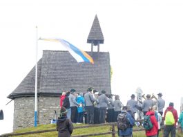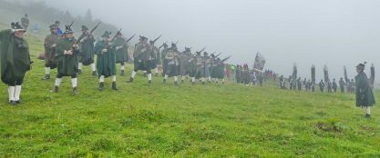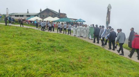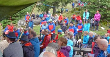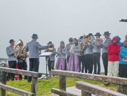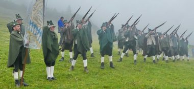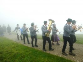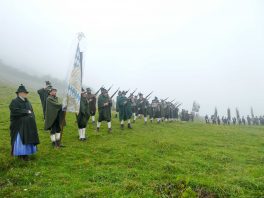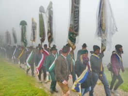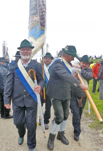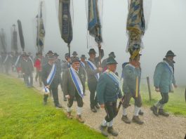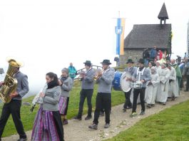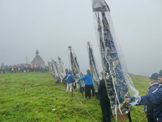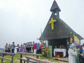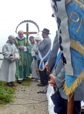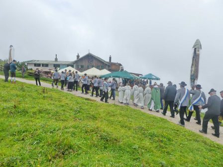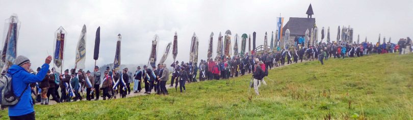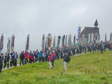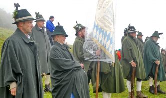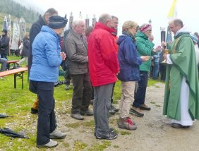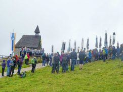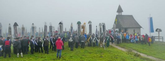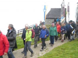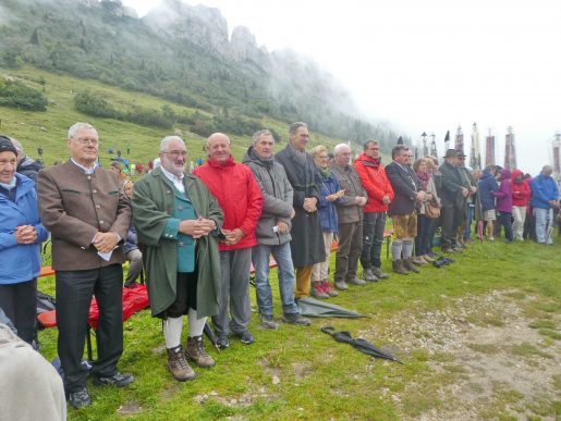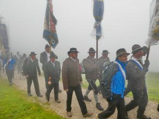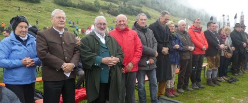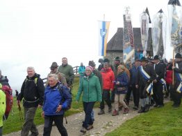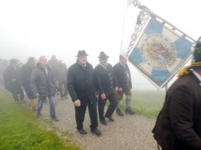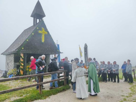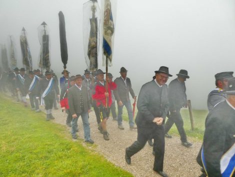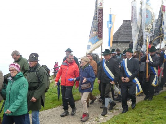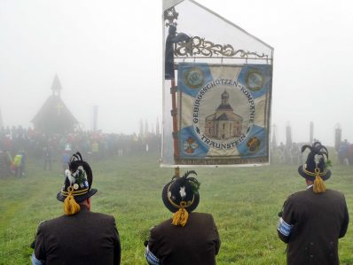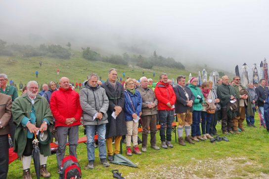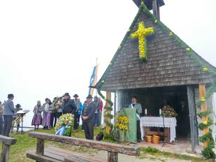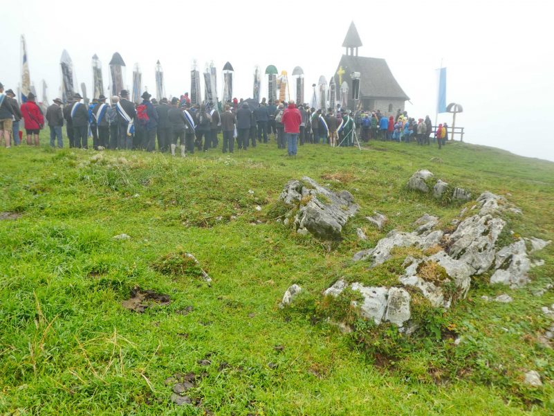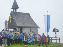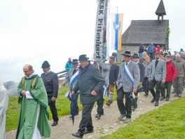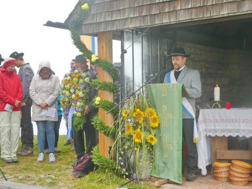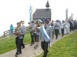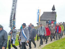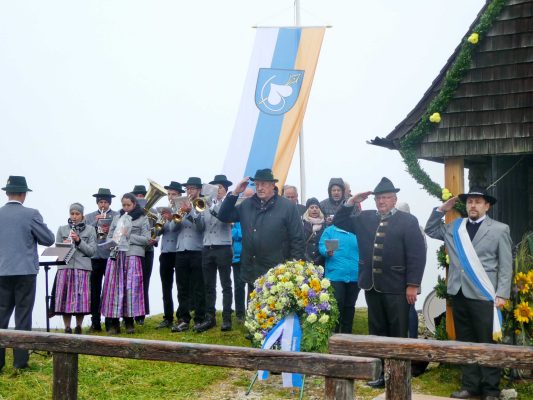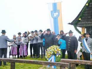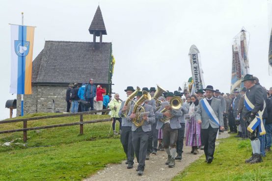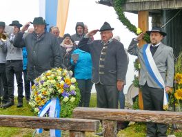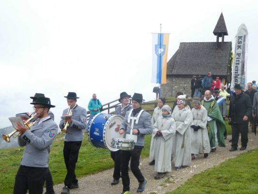 Pfarrer David Mehlich, der mit dem kirchlichen Dienst aus dem Pfarrverband Obing-Pittenhart-Kienberg und mit der Jugendblaskapelle Seeon den Gottesdienst gestaltete, bat in seiner Predigt angesichts des dichten Bergnebels, sich im Leben nicht nur auf das optisch Sichtbare zu konzentrieren. „Optimismus können wir am Kreuz ablesen, denn es ist ein Zeichen der Hoffnung – auch für die Verstorbenen. Die Welt geht nicht den Bach runter, machen wir auch der Jugend Mut, schließlich dürfen 70 Jahre Frieden uns nicht gleichgültig sein“, so der Geistliche, der zum Abschluss des Gottesdienstes auch noch das rechts von der Kapelle stehende Kreuz nach erfolgter Restaurierung segnete. Ehe Reinhard Schreiner als 1. Vorstand der Krieger- und Soldatenkameradschaft Pittenhart zusammen mit Michael Bernauer, Gauvorstand der Vereinigten Krieger- und Soldatenkameradschaften Chiemgau und Rupertigau und mit 1. Obmann Pius Graf von der Interessengemeinschaft der Krieger-, Veteranen- und Soldatenkameradschaften im Landkreis Rosenheim einen Kranz niederlegte, sagte er: „100 Jahre nach dem I. Weltkrieg mit 19 Millionen Toten und nach dem II. Weltkrieg mit gar 60 Millionen Toten müssen wir alle Anstrengungen unternehmen, dass Friedens-Erhaltung keine Selbstverständlichkeit zum Nulltarif ist“. Alsdann wurde zur gemütlichen Einkehr bei inzwischen spürbar gestiegenen Temperaturen zur Steinlingalm marschiert. Ein abschließender Dank für die würdevolle Feier gab es noch für die Aschauer Alphornbläser, für die Gebirgsschützenkompanie Aschau für deren Salutschießen, dem Obst- und Gartenbauverein Pittenhart für die Ausschmückung der Kapelle sowie der Bergwacht, der Feuerwehr Pittenhart, der Gemeinde Aschau und der Kampenwandbahn für all deren Unterstützung und Entgegenkommen.