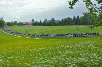 Pünktlich um 9.00 Uhr setzte sich der lange Zug der Trachtlerinnen und Trachtler in Siegsdorf in Bewegung und 97 Vereinsfahnen sowie knapp 2500 Frauen und Männer, Buam und Dirndl schlossen sich dem Siegsdorfer Wallfahrerkreuz und der Gauvorstandschaft an und machten sich betend auf den langen Weg hinauf nach Maria Eck. Am Freialtar unterhalb des Klosters wurden die Wallfahrer und einige hundert Besucher mit donnerndem Salut von den Weihnachtsschützen aus Ettenberg/Berchtesgaden empfangen.