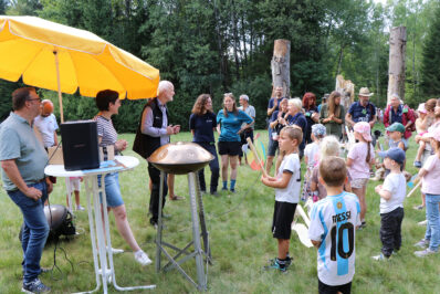 Höhepunkt der Veranstaltung war schließlich ein Konzert mit den Spechtophonen und die anschließende Verteilung von Glasspechten an einem Lederband durch Nationalparkleiterin Ursula Schuster. „Es freut mich sehr, dass ihr alle heute zusammen mit euren Eltern und Großeltern den Weg zu uns ins Waldspielgelände gefunden habt.“ An diesem Nachmittag hätten die Kinder sicherlich viel über die Musiker des Waldes erfahren. „Damit ihr auch Zuhause einen eigenen Specht habt, habe ich euch ein Geschenk mitgebracht.“