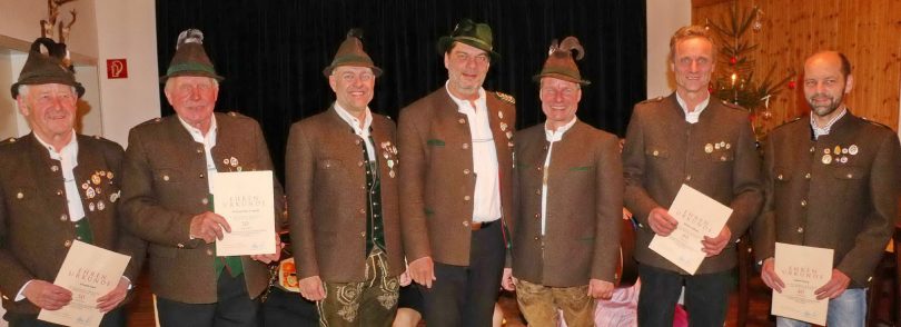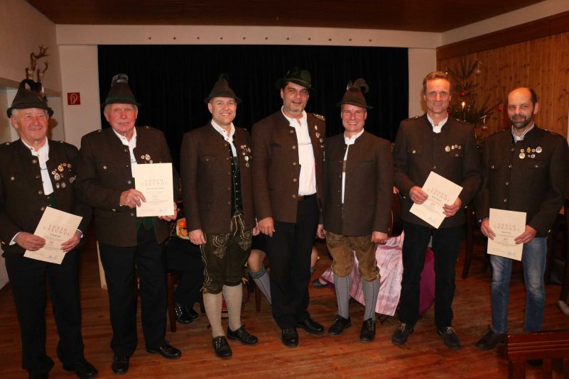 Ein halbes Jahrhundert sind Josef Freund und Leopold Baumgartner aktive Mitglieder bei der Schützengesellschaft „Die Elfer“ Wildenwart. Bei der Versammlung in der Wildenwarter Schlosswirtschaft erhielten sie das Ehrenzeichen des deutschen und des bayerischen Sportschützenbundes (DSSB/BSSB) für ihre 50-jährige aktive Mitgliedschaft beim Schützenverein. „Die beiden heute ausgezeichneten Schützen sind ein Vorbild für alle jungen Schützen des Vereins“, so Gauschützenmeister Bernhard Brehmer, „auch mit über 70 Jahren stellen sie eine wertvolle verlässliche Stütze für die „Elfer“ dar“. Gauschützenmeister Bernhard Brehmer freute sich, insgesamt sieben Mitgliedern die Ehrenurkunden überreichen zu dürfen. Josef Freund und Leopold Baumgartner erhielten die Auszeichnung für 50 Jahre, Johann Bohrer und Georg Anner für 40 Jahre. Das silberne Abzeichen für 25 Jahre aktive Arbeit in einem Schützenverein des DSSB und BSSB erhielten Florian Riesinger, Markus Friedrich und Konrad Eckl.