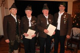 Bericht und Foto: Heinrich Rehberg – Der Schützenmeister der „Elfer Wildenwart“ Andreas Freund junior (links) und Gauschützenmeister Bernhard Brehmer (rechts) übergaben das Ehrenzeichen des deutschen und des bayerischen Sportschützenbundes (DSSB/BSSB) für 50-jährige aktive Mitgliedschaft beim Wildenwarter Schützenverein an Josef Freund und Leopold Baumgartner