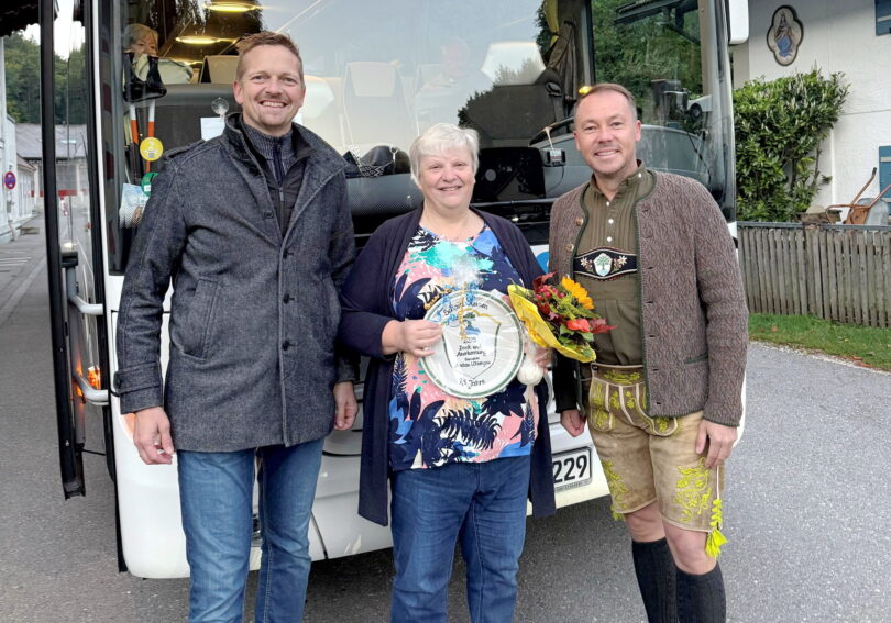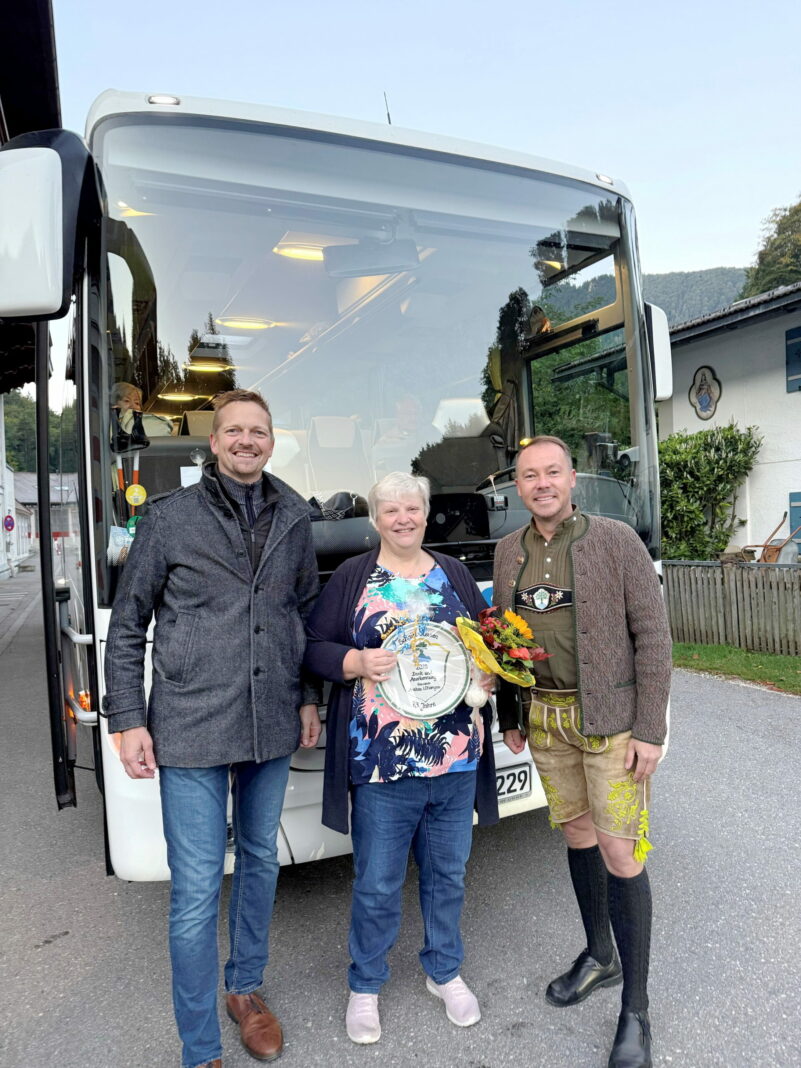 Beim Aufbruch zum Jubiläumsausflug zur Waldhäuslalm überraschten sie Erster Bürgermeister Simon Frank und Tourismuschef Herbert Reiter, um Glückwünsche zum Jubiläum zu überbringen.