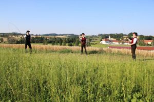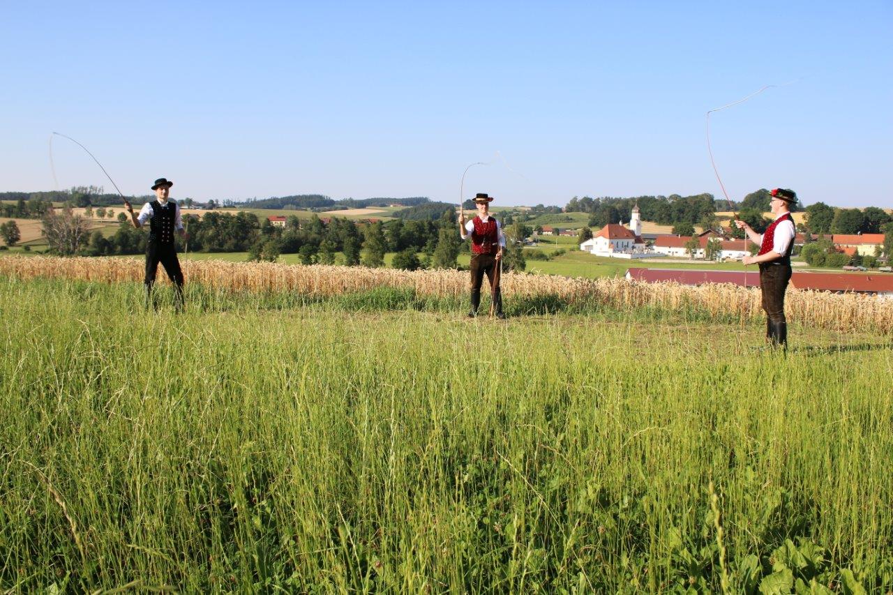 Die Goaslschnalzer des Vereins, mit Blick auf das Dorf Hinterskichen