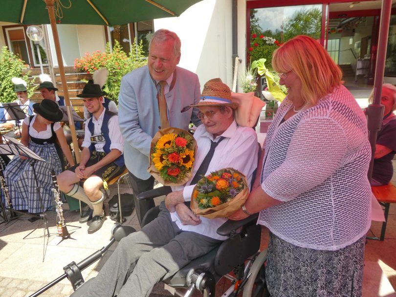 Am Tag des heurigen Sommerfestes konnte bei einem sonnigen Sonntag Bewohner Peter Murner im Caritas-Altenheim St. Josef in Prien-Trautersdorf seinen 80. Geburtstag feiern. Peter Murner aus Lienzing bei Gollenshausen war nach einem schweren Unfall zwei Jahre lang im Krankenhaus ehe er vor gut zwanzig Jahren ins Priener Altersheim kam. Zu seinem Geburtstag gratulierte namens der Heimleitung Theresia Meisl und für die Marktgemeinde Prien überbrachte Zweiter Bürgermeister Hans-Jürgen Schuster ebenfalls einen Blumenstrauß.