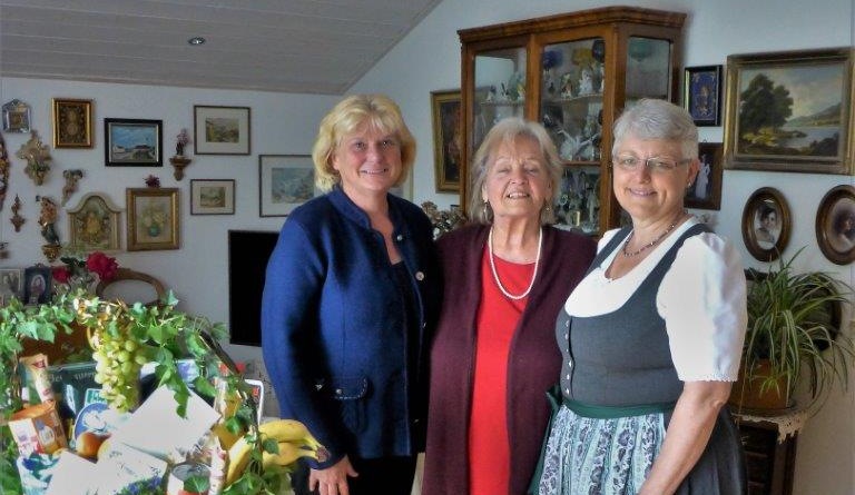 Ihren 80. Geburtstag konnte Erna Sewald aus Fading am Samerberg feiern. Erna Sewald wurde im Juni 1937 in Heufeld bei Bruckmühl als Ältere von zwei Mädchen geboren. Sie ist mit ihren Eltern und ihrer Schwester in Bad Aibling aufgewachsen und erlernte den Beruf der Hotelfachfrau. Später arbeitete Sie 18 Jahre als Badefrau in einer Klink. Seit 59 Jahren ist Frau Sewald mit ihrem Mann Alois verheiratet. Aus der Ehe eine Tochter hervor. Das Ehepaar zog vor elf Jahren auf den Samerberg nach Fading zu ihrer Tochter und der einzigen Enkelin. Dort haben sie sich im Eigenheim der Tochter eine Wohnung eingerichtet. Hier lebt Frau Sewald ihre Liebe zur Klosterarbeit aus, wie an vielen Bildern und Fatschenkindl sehen kann. Die rüstige Jubilarin liebt die Geselligkeit und entspannt bei klassischer Musik. Sie pflegt mit ihrem Mann liebevoll den Garten und kümmert sich besonders um die schönen Rosen. Die Glückwünsche der Pfarrgemeinde überbrachte Katharina Hartmann und die Glückwünsche der Gemeinde wurden von der 3. Bürgermeisterin Annemarie Braun (re.) überbracht.
