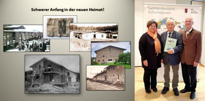 Repros / Fotos: 1. Folie Sudetendeutsch – mit den Bildern (im Kreis rechtsrum) Verladung im Viehwaggon – Armbinde mit “N” für némec (deutsch) – Barackenlager in Haidholzen für viele sudetendeutsche Flüchtlinge/Heimatvertriebene – Bauernhof der Familie Bürger in Weng bei Griesstätt – “Neue Heimat” = Straße mit Neubauten in der Erlenau (Rosenheim), ca. 1959 – Hausbau der Familie Karl und Elisabeth Schwarzer in Haidholzen.