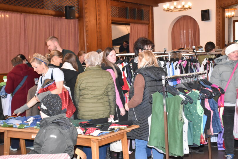 Eine lange Schlange mit Interessierten stand vor der Öffnung des Prinzregentensaals in Marquartstein und wartete geduldig auf Einlass. Es erwartete die Besucher der große Saal voll mit ordentlich aufgestellten Kleiderständern. Auf Bügeln und nach Größen sortiert sahen die meist weiblichen Besucher ein großes Angebot mit Kleidung, das jedes Trachten-Herz höherschlagen ließ.
