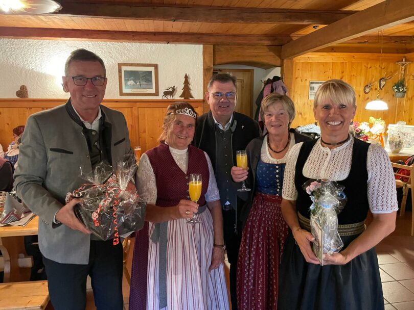 Bericht und Foto: Gemeinde Samerberg – An der „Doagl-Alm“ gratulierten Veronika Weyerer (zweite von links) eine Reihe weiterer Gäste, darunter Bürgermeister Georg Huber, Diakon Günter Schmitzberger, Maria Staber von den Senioren und Ramona Sattlberger vom Trachtenverein Grainbach.