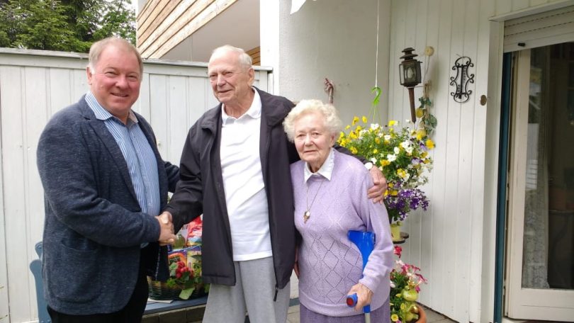 Foto: Manfred Altvater mit seiner Ehefrau Elfriede und mit Zweiten Bürgermeister Christoph Heibler (li.) am Tag seines 90. Geburtstags in Grainbach