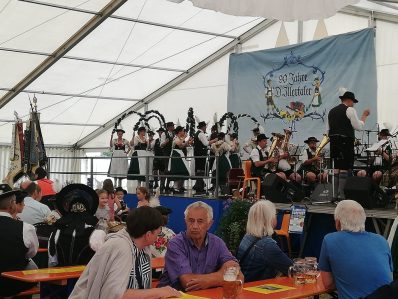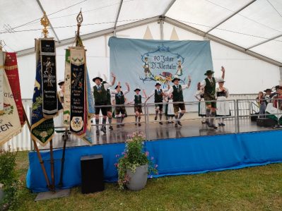 Nach dem Gottesdienst wurde im Festzelt auf dem Kirchplatz weitergefeiert. Neben der musikalischen Umrahmung durch die Trachtenkapelle Illerzell, wurden Tänze und Plattler unseres Vereins und der Gäste aufgeführt. Die Patenvereine Bayermünching Merching, und Ottobeuren überbrachten Glückwünsche und Geschenke und einige Mitglieder unseres Vereines erhielten aus der Hand des 1.Gauvorstandes Horst Müller das Gauehrenzeichen.