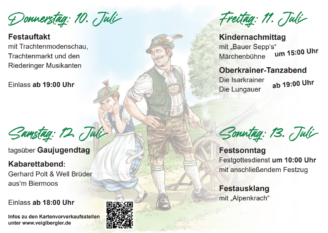 Der Samstag gehört der Loisachgauer Trachtenjugend. Zum Gaujugendtag werden ca. 600 Kinder und Jugendliche aus dem ganzen Loisachtaler Gauverband erwartet. Nach einer Andacht und dem Festumzug zeigen diese nicht nur ihr Können auf der Bühne sondern auch ihr Geschick an verschiedenen Spielstationen. Am Abend sorgen Gerhard Polt und die Well Brüder für gute Stimmung. Karten zum Preis von 27,-€ sind im Kartenvorverkauf ab sofort erhältlich. Infos zu den Vorverkaufsstellen unter www.veiglbergler.de.