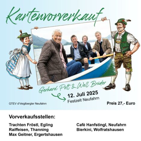 Zu den jährlichen Vereinsterminen wie dem Kaffeekranzl, Trachtenjahrtag und vielem mehr steht am Faschingssamstag 1. März 2025 ab 12:34 Uhr wieder eine Bettelhochzeit an. Nach einer hoffentlich erfolgreichen Wachzeit wird am 1. Mai ein neuer Maibaum aufgestellt und der Burschenverein Neufahrn lädt am darauffolgenden Samstag, 3. Mai zur Maimusi ein. Der Höhepunkt des Festjahres ist das Festwochenende vom 10. bis 13. Juli. Zum Festauftakt am Donnerstag 10. Juli spielen die Riederinger Musikanten. Abgerundet wird der Abend durch eine Trachtenmodenschau von Trachten Fröstl aus Egling und einem Trachten- und Handwerkermarkt. Am Freitagnachmittag lädt Bauer Sepp´s Märchenbühne die Jüngsten ins Festzelt und am Abend sorgen die Isarkrainer und die Lungauer für beste Stimmung beim Tanzabend.