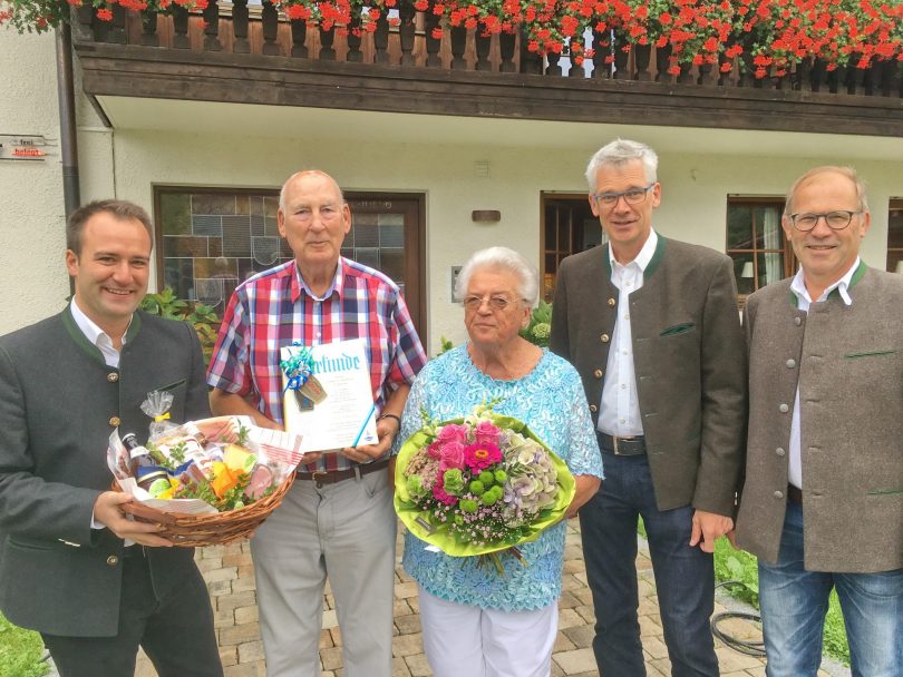 Bürgermeister Philipp Bernhofer und Christoph Osterhammer, Leiter der Tourist-Info bedankten sich bei dem Ehepaar mit einem Geschenkkorb, einen Blumenstrauß, einem Bildband zur Künstlerlandschaft Chiemsee, der goldenen Ehrennadel und einer Ehrenurkunde für die Treue zum Urlaubsort Bernau.