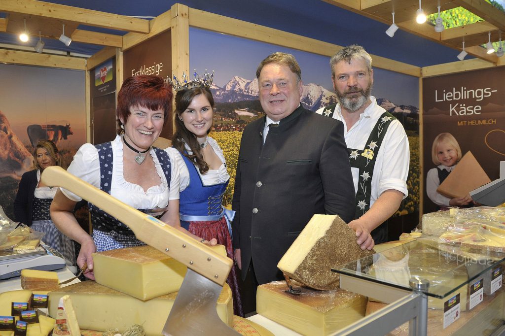 Minister Helmut Brunner (2. v. r.) mit Käsesommelière Roswitha Boppeler, Bayerns Milchkönigin Sonja Wagner und Käser Rupert Roggors.