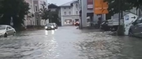 Der heute Abend einsetzende Starkregen führte in Prien am Chiemsee in kürzester Zeit zu Hochwasser und Überschwemmung der Straßen – wie dieses aktuelle Video der freiwilligen Feuerwehr Atzing zeigt.