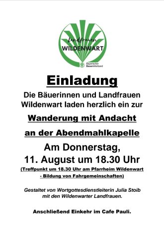 Die Wildenwarter Landfrauen laden am kommenden Donnerstag, den 11. August ein zu einer Wanderung mit einer Andacht an der Abendmahlkapelle in Aschau. Treffpunkt ist um 18.30 Uhr am Pfarrheim in Wildenwart. Die Andacht gestaltet die Wortgottesdienstleiterin Julia Stoib zusammen mit den Landfrauen. Im Anschluss wird in das Cafe Pauli eingekehrt.