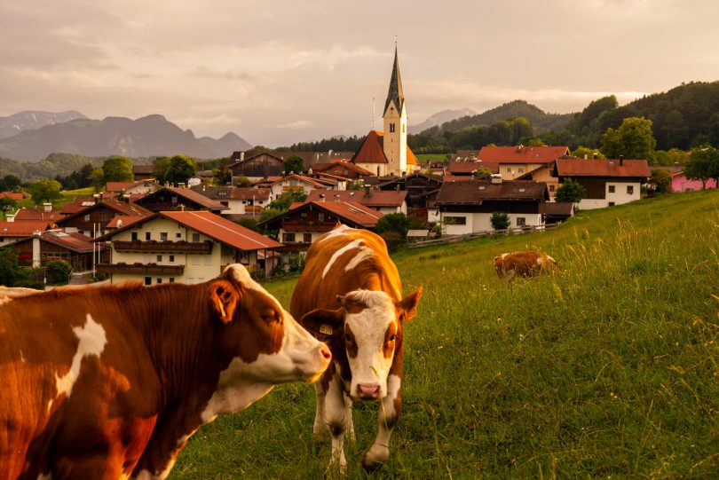 Frisches Gras, sonnige Stimmungen und eine Aussicht wie aus dem Bilderbuch – das bietet der Ort Törwang in der Gemeinde Samerberg für Mensch und Tier – wie diese aktuelle Aufnahme mit jungen Rindern und mit der Pfarrkirche „Maria Himmelfahrt“ zeigt.