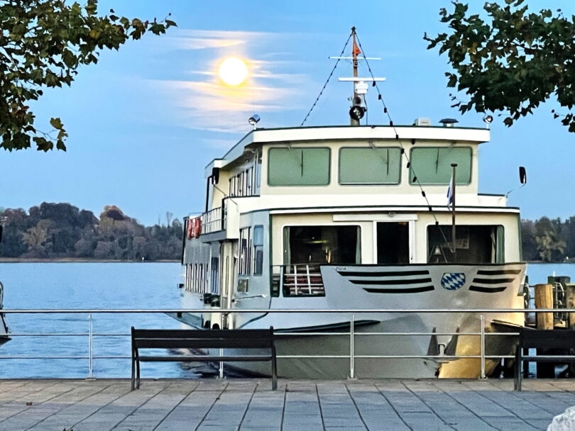 Bei passender Bewölkung zeigt sich das Ufer am Bayerischen Meer dann in besonders stimmungsvoller Weise und mit seltenen Lichtspielen – wie in diesen Tagen zum Vollmond wieder einmal.