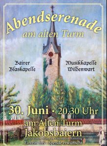 Zum zweiten Mal treffen Bairer und Wildenwarter Blasmusikanten am 30. Juni zusammen. Nachdem erstmals ein Doppelkonzert in Frasdorf war, kommt es nunmehr zum Gegenbesuch. Die Abendserenade mit beiden Kapellen beginnt am 30. Juni um 20.30 Uhr am Alten Turm Jakobsbaiern (bei schlechtem Wetter im Vereinsheim Antholling). Der Eintritt ist frei, Spenden für den Musikantennachwuchs sind erwünscht.