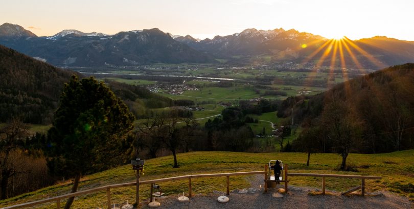 Einen ganzjährig und ganztägig reizvollen und einladenden Blick bietet die Dandlbergalm auf dem Samerberg. Die gut bewirtschaftete Alm kann von Samerberg-Schilding, von Steinkirchen und von Neubeuern auf verschiedenen Wegen erreicht werden. Zu beachten: montags und dienstags ist Ruhetag. Unsere aktuelle Aufnahme vermittelt einen stimmungsvollen Eindruck vom Dandlberg-Alm-Blick auf das Inntal, auf die dahinter liegenden Berge und auf die untergehende Sonne.