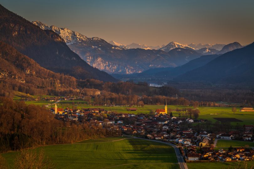 Einem Gemälde gleich sowie einen Augen und Herzen gleichermaßen erquickenden Anblick bietet das bayerische Inntal mit seinen Orten und Bergen im Licht der Frühjahrs-Abendsonne – wie diese aktuelle Aufnahme von Nussdorf am Inn mit den beiden herausleuchtenden Kirchen St. Vitus und St. Leonhard zeigt. Nicht umsonst hat die Gemeinde Nußdorf schon vor Jahrzehnten mit dem Motto “Die Perle am Inn” geworben und ist bei nationalen und internationalen Auszeichnungen als “Schönstes Dorf” ausgezeichnet worden.