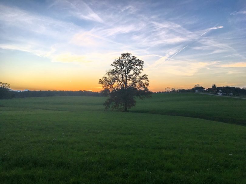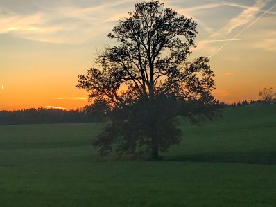 Eine Eiche prägt das Landschaftsbild zwischen den Priener Ortsteilen Gaishacken und Stetten. Bei den derzeitigen schönen Oktober-Sonnentagen ergeben sich am Tagesende anschauliche Stimmungsbilder.