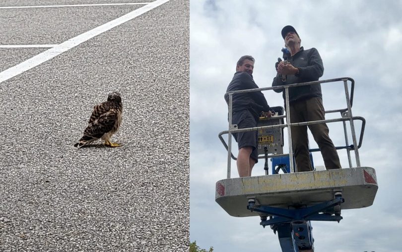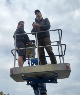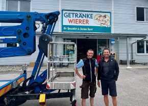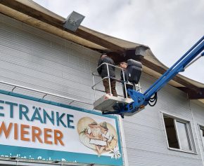 Innerhalb einer knappen Stunde waren dann alle Helfer vor Ort und die Rettungsaktion mittels Hebebühne konnte beginnen. Beim Aufstellen des Krans war durch ein Gerangel der jungen Turmfalken auf einem schmalen Balken zwischenzeitlich ein weiterer Falke aus dem Horst gestürzt. Beide Jungfalken konnten jedoch schnell und erfolgreich durch Herrn Weinberger und Herrn Schedlbauer in ihren Horst oberhalb des Getränkemarktes zurückgesetzt werden.