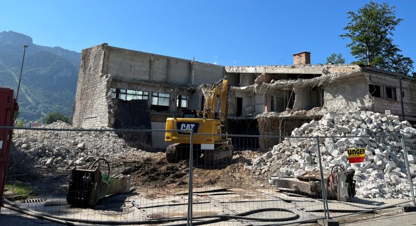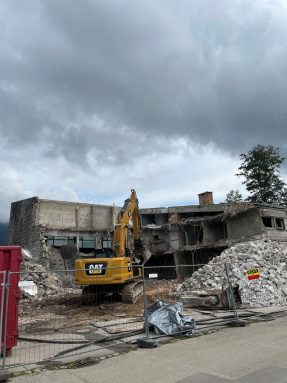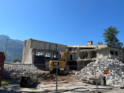 Seit mehreren Tagen läuft der maschinelle Abbruch auf vollen Touren, Teile des Abbruchs, wie die Natursteinfassade im Osten und der verbaute Beton werden an der Baustelle gebrochen. Mit diesem Material wird der alte Keller verfüllt. Auf diesem massiven Füllmaterial wird dann der Neubau erstellt. „Die Baumeisterarbeiten sind vergeben und beginnen unmittelbar nach dem Ende des Abbruchs, voraussichtlich Anfang August“, so Bürgermeister Andrelang. Nach einer langen mehrjährigen Planungsphase und vielen kontroversen Diskussionen zum Neubau der Sporthalle ist damit ein Anfang zu sehen, die ersten Schritte zum Bau der neuen Halle sind gemacht.