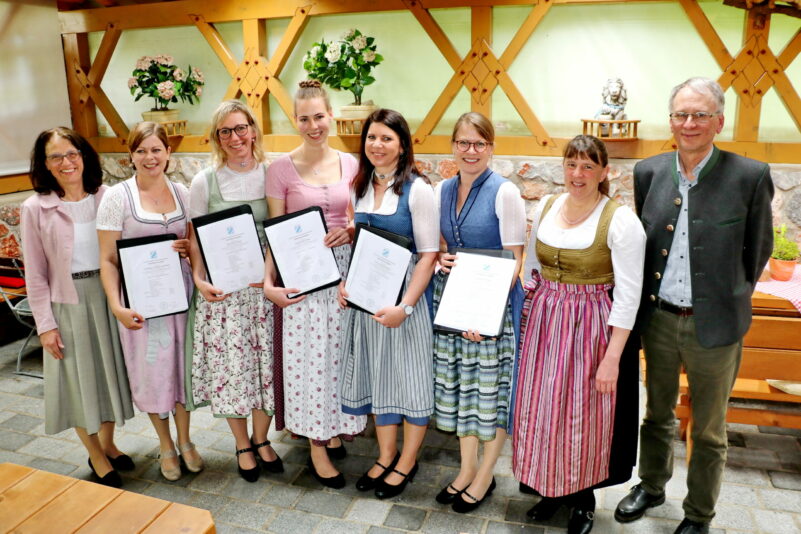 In der Kirche Heilig Kreuz von Höhenberg hielt Ruhestandspfarrer Georg Gilgenrainer im Rahmen der Schulschlussfeier eine Andacht für die jungen Frauen, ihre Gäste und ihre Angehörigen. Er nannte die Hauswirtschaft ein Stück Kultur unserer Heimat. „In einem gepflegten Zuhause fühlen sich alle wohl, ein gut organisierter Haushalt stellt dabei die Grundlage dar“. Zum Beginn der Andacht machte er die Absolventinnen auf die wertvolle künstlerische Ausstattung des unscheinbaren Kirchleins aufmerksam, auch hier gelte das Prinzip: „mehr Sein als Scheinen“. Anna Bruckmeier blickte zurück auf den abgelaufenen Lehrgang: Der einsemestrige Studiengang Hauswirtschaft an der Staatlichen Landwirtschaftsschule in Rosenheim lehrt, einen Haushalt – insbesondere in der Landwirtschaft – fachkundig zu führen und stellt damit eine wichtige Voraussetzung für die Tätigkeit als Bäuerin oder für ein Einkommen mit hauswirtschaftlicher Tätigkeit. Der Studiengang Hauswirtschaft vermittelt praktische Fertigkeiten und Fachwissen in den Bereichen Hauswirtschaft sowie Familien- und Haushaltsmanagement. Er stärkt Persönlichkeit und Auftreten, fördert unternehmerisches Denken und Handeln und vermittelt die berufs- und arbeitspädagogische Eignung zum Ausbilden und Anleiten von Personen. Der Unterricht fand zur besseren Vereinbarkeit von Familie, Haushalt und Berufstätigkeit in Teilzeitform statt. Die Unterrichtsstunden und Schultage wurden in Absprache mit den Interessentinnen festgelegt. Die 630 Unterrichtsstunden verteilten sich auf einen Zeitraum von etwa anderthalb Jahren. Der Unterricht fand mit einigen Stunden am Dienstagabend und am Mittwoch ganztägig statt. „Nach der erfolgreicher Abschlussprüfung zur Hauswirtschafterin bestehen verschiedene weitere Möglichkeiten der beruflichen Fortbildung zum Beispiel zur Meisterin der Hauswirtschaft“.