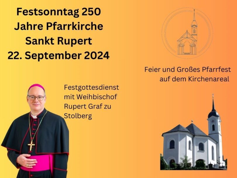 Mit der Feier des Patroziniums von St. Rupert erreichen die Feierlichkeiten am Sonntag, den 22. September, ihren Höhepunkt. Der Festgottesdienst beginnt um 10.15 Uhr und wird von Weihbischof Rupert Graf zu Stolberg zelebriert. Im Anschluss daran findet ein großes Pfarrfest im Pfarrgarten zwischen Pfarrheim und Kirche statt.