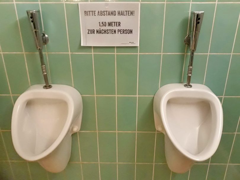 Dieses Bild, das in Rothenburg ob der Tauber entstand, hat den Fotografen anfänglich verwirrt als er las “1,50 Meter Abstand halten” – doch als er den Abstand für die Breite vernahm, war er schon wieder erleichtert, denn sonst wäre seine geplante Erleichterung nur mit einer großen Portion Zielwasser möglich gewesen.