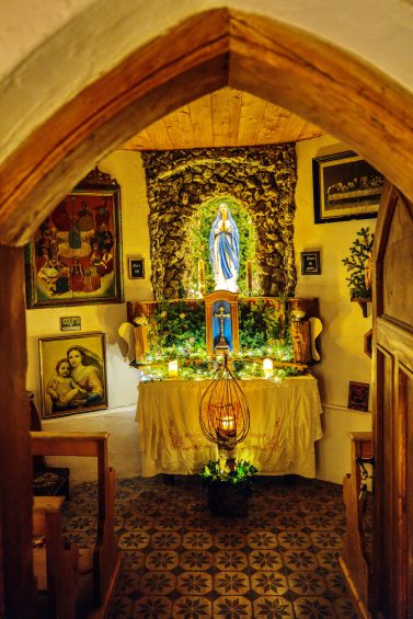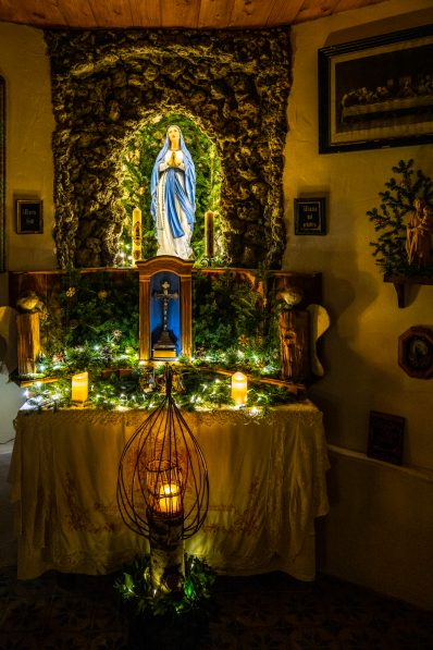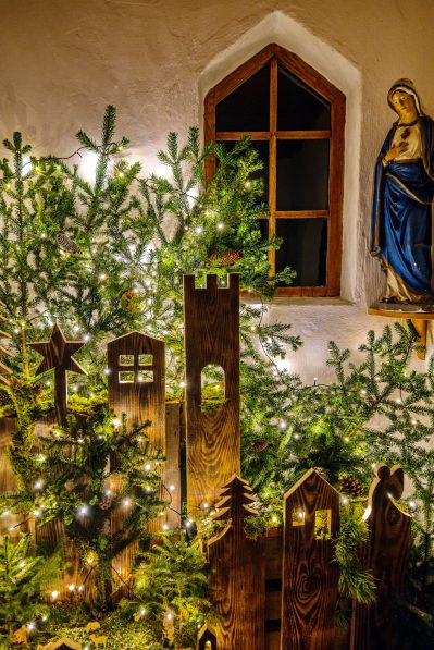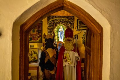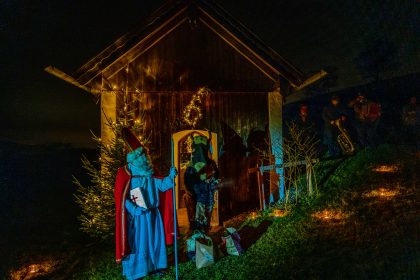 Die Lourdeskapelle in Guggenbichl war am Namenstag des Heiligen Nikolaus an der Reihe bei der heurigen Adventaktion des Weihnachtsmarktes Achenmühle e.V. Jeden Tag öffnet sich in Achenmühle, Höhenmoos oder in einem der Nachbardörfer in einem Haus ein Fenster, um auf diese Weise Adventskalender-Freuden zu verbreiten. Unsere Aufnahmen entstanden am Abend bei der Kapelle, die ursprünglich ein kleiner Bildstock war, später entstand daraus eine Lourdes-Grotte und dann eine Kapelle. Diese wurde 1982 von der Familie Loferer nach dem Gaufest beim Trachtenverein “Edelweiß” Höhenmoos in Privat-Initiative originalgetreu erneuert. Nach Einbruch der Dunkelheit und im Laufe des Abends kamen auch der Heilige Nikolaus mit seinem Knecht Rupprecht sowie einige Weisen spielende Musikanten vorbei. Bei dieser Aktion des Weihnachtsmarktes Achenmühle gibt es keine festen Uhrzeiten, zu denen sich die Leute vor dem “Tages-Fenster” zur Betrachtung einfinden.