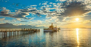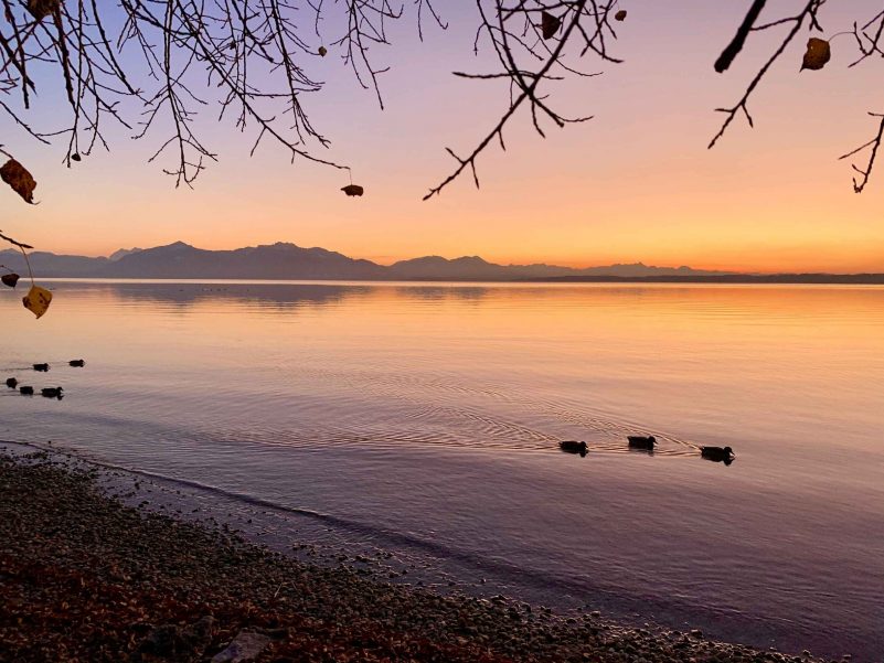 Gerade die Adventszeit steht für stimmungsvolle Momente. Dafür bekannt ist auch die sogenannte blaue Stunde die zum Anbruch des Abends einläutet. Eine fantastische Stimmung zeigte sich dabei am Bayerischen Meer, als Horizont und See in wärmenden Farben erleuchten. Im Hintergrund zeichnen die heimischen Berge, von Kampenwand bis Wendelstein, noch ein beherrschendes und zugleich beschützendes Zeichen. Einige Enten ziehen dabei noch über den schlummernden Chiemsee und geben dieser Fotoaufnahme noch das Gewisse Etwas.