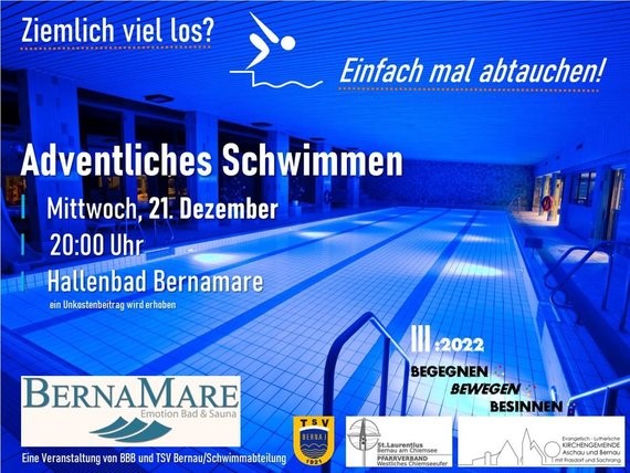 Im Rahmen von Begegnen – Bewegen – Besinnen (BBB), den gemeinsamen Sportexerzitien von evangelischer und katholischer Gemeinde in Bernau, findet am Mittwoch, den 21. Dezember um 20 Uhr in Kooperation mit dem TSV Bernau ein besonderes Adventliches Schwimmen im Hallenbad Bernau statt. Ein Unkostenbeitrag wird erhoben.